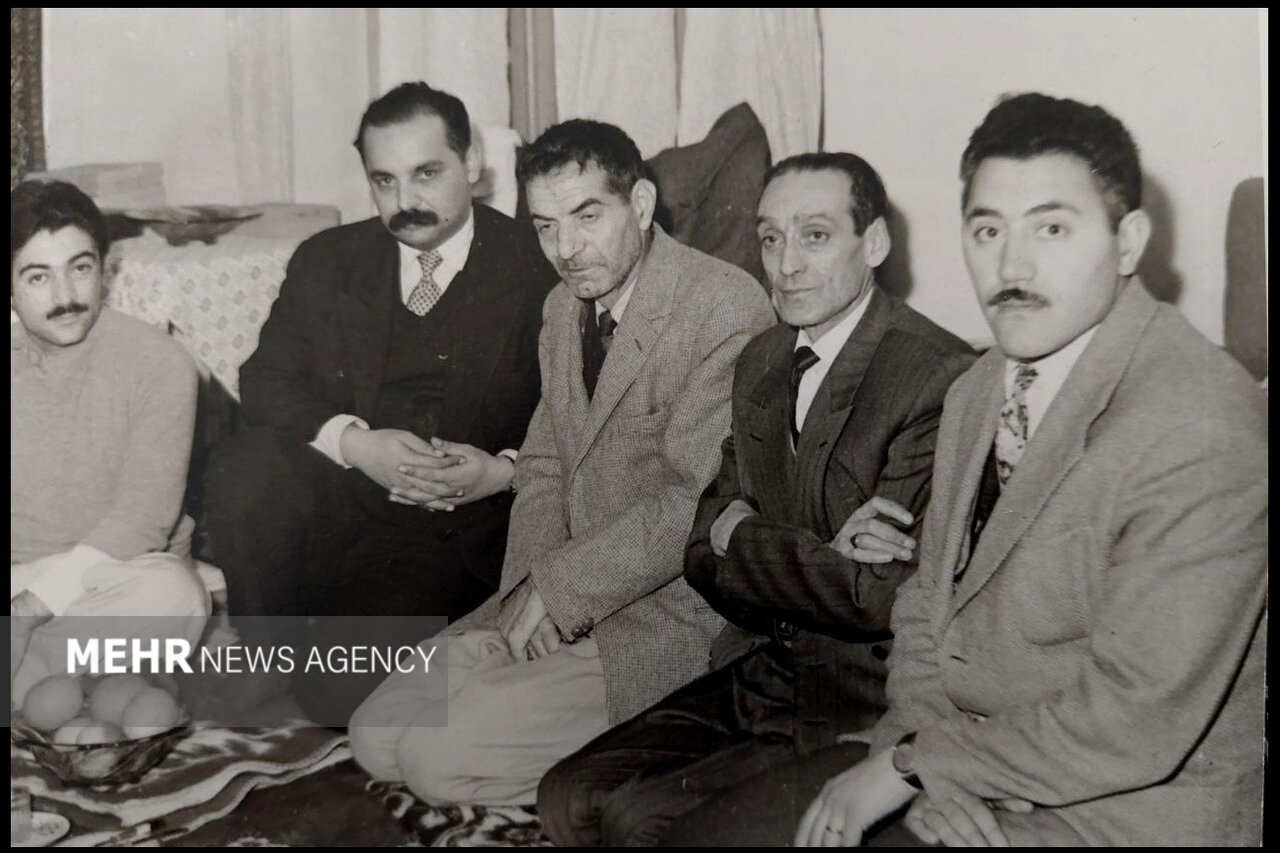 از راست: مفتون امینی (شاعر)، استاد محمد حسن عذاری (موسیقیدان و نوازنده تار تبریزی)، استاد شهریار، هوشنگ ابتهاج (شاعر)، نادر نادر پور (شاعر)